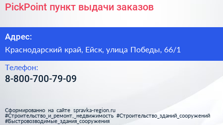 PickPoint, пункт выдачи заказов по адресу Краснодарский край, Ейск, улица Победы, 66/1 в дальнейшем Организация, размещена в следующих категориях: