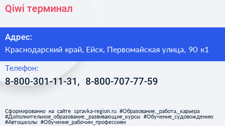 Qiwi, терминал по адресу Краснодарский край, Ейск, Первомайская улица, 90 к1 в дальнейшем Организация, размещена в следующих категориях: