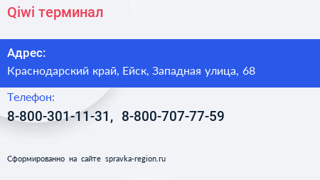 Qiwi, терминал по адресу Краснодарский край, Ейск, Западная улица, 68 в дальнейшем Организация, размещена в следующих категориях: