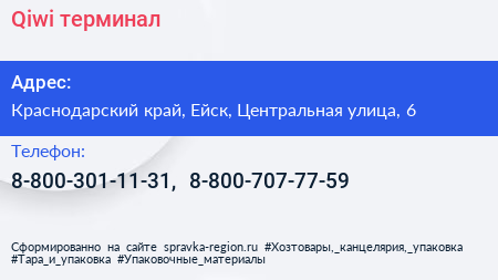 Qiwi, терминал по адресу Краснодарский край, Ейск, Центральная улица, 6 в дальнейшем Организация, размещена в следующих категориях:
