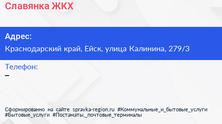 Славянка, ЖКХ по адресу Краснодарский край, Ейск, улица Калинина, 279/3 в дальнейшем Организация, размещена в следующих категориях: