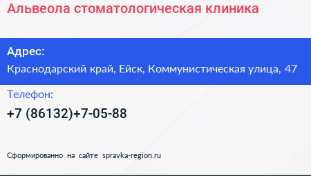 Альвеола, стоматологическая клиника по адресу Краснодарский край, Ейск, Коммунистическая улица, 47 в дальнейшем Организация, размещена в следующих категориях:
