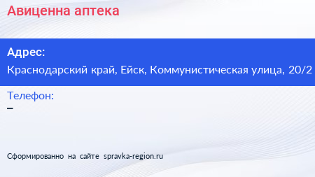 Авиценна, аптека по адресу Краснодарский край, Ейск, Коммунистическая улица, 20/2 в дальнейшем Организация, размещена в следующих категориях: