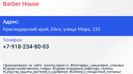 Barber House по адресу Краснодарский край, Ейск, улица Мира, 133 в дальнейшем Организация, размещена в следующих категориях: