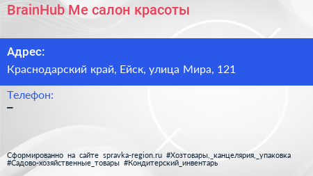 BrainHub.Me, салон красоты по адресу Краснодарский край, Ейск, улица Мира, 121 в дальнейшем Организация, размещена в следующих категориях: