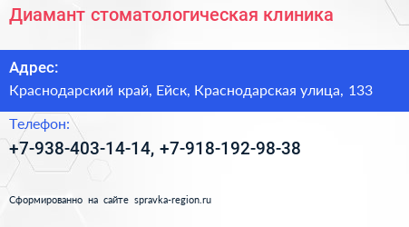 Диамант, стоматологическая клиника по адресу Краснодарский край, Ейск, Краснодарская улица, 133 в дальнейшем Организация, размещена в следующих категориях: