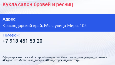 Кукла, салон бровей и ресниц по адресу Краснодарский край, Ейск, улица Мира, 105 в дальнейшем Организация, размещена в следующих категориях: