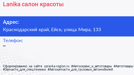 Lanika, салон красоты по адресу Краснодарский край, Ейск, улица Мира, 133 в дальнейшем Организация, размещена в следующих категориях:
