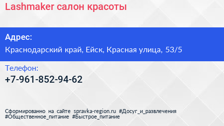 Lashmaker, салон красоты по адресу Краснодарский край, Ейск, Красная улица, 53/5 в дальнейшем Организация, размещена в следующих категориях: