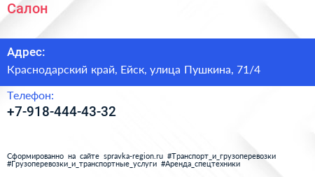 Салон по адресу Краснодарский край, Ейск, улица Пушкина, 71/4 в дальнейшем Организация, размещена в следующих категориях: