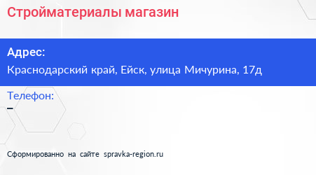 Стройматериалы, магазин по адресу Краснодарский край, Ейск, улица Мичурина, 17д в дальнейшем Организация, размещена в следующих категориях: