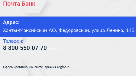 Почта Банк по адресу Ханты-Мансийский АО, Федоровский, улица Ленина, 14Б в дальнейшем Организация, размещена в следующих категориях:
