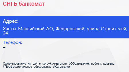 СНГБ, банкомат по адресу Ханты-Мансийский АО, Федоровский, улица Строителей, 24 в дальнейшем Организация, размещена в следующих категориях: