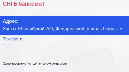 СНГБ, банкомат по адресу Ханты-Мансийский АО, Федоровский, улица Ленина, 6 в дальнейшем Организация, размещена в следующих категориях: