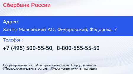 Сбербанк России по адресу Ханты-Мансийский АО, Федоровский, Фёдорова, 7 в дальнейшем Организация, размещена в следующих категориях: