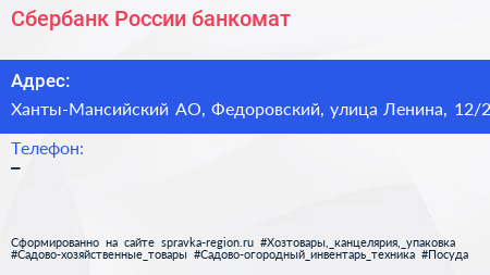 Сбербанк России, банкомат по адресу Ханты-Мансийский АО, Федоровский, улица Ленина, 12/2 в дальнейшем Организация, размещена в следующих категориях: