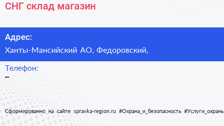 СНГ, склад-магазин по адресу Ханты-Мансийский АО, Федоровский, в дальнейшем Организация, размещена в следующих категориях: