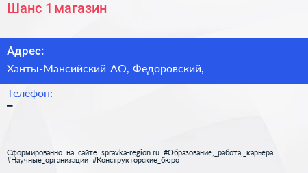 Шанс-1, магазин по адресу Ханты-Мансийский АО, Федоровский, в дальнейшем Организация, размещена в следующих категориях: