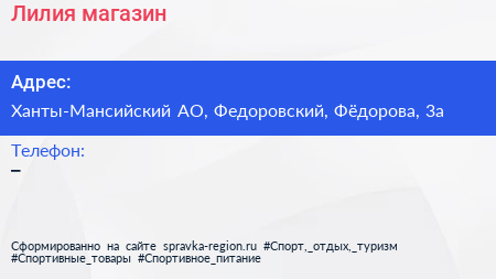 Лилия, магазин по адресу Ханты-Мансийский АО, Федоровский, Фёдорова, 3а в дальнейшем Организация, размещена в следующих категориях: