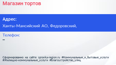 Магазин тортов по адресу Ханты-Мансийский АО, Федоровский, в дальнейшем Организация, размещена в следующих категориях: