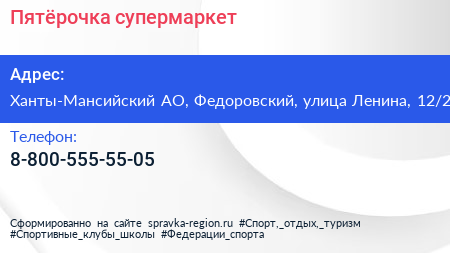 Пятёрочка, супермаркет по адресу Ханты-Мансийский АО, Федоровский, улица Ленина, 12/2 в дальнейшем Организация, размещена в следующих категориях: