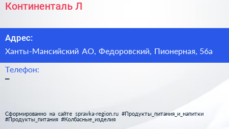 Континенталь-Л по адресу Ханты-Мансийский АО, Федоровский, Пионерная, 56а в дальнейшем Организация, размещена в следующих категориях: