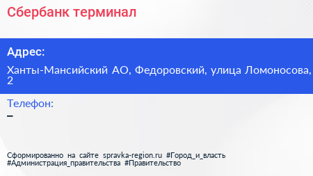 Сбербанк, терминал по адресу Ханты-Мансийский АО, Федоровский, улица Ломоносова, 2 в дальнейшем Организация, размещена в следующих категориях: