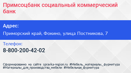 Примсоцбанк, социальный коммерческий банк по адресу Приморский край, Фокино, улица Постникова, 7 в дальнейшем Организация, размещена в следующих категориях: