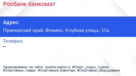 Росбанк, банкомат по адресу Приморский край, Фокино, Клубная улица, 15а в дальнейшем Организация, размещена в следующих категориях:
