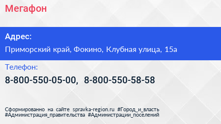 Мегафон по адресу Приморский край, Фокино, Клубная улица, 15а в дальнейшем Организация, размещена в следующих категориях: