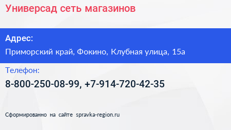 Универсад, сеть магазинов по адресу Приморский край, Фокино, Клубная улица, 15а в дальнейшем Организация, размещена в следующих категориях: