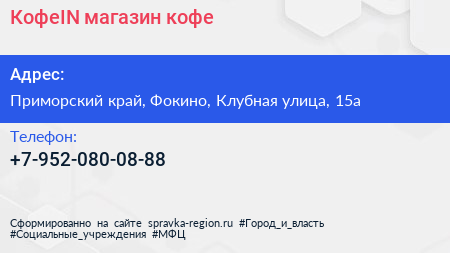 КофеIN, магазин кофе по адресу Приморский край, Фокино, Клубная улица, 15а в дальнейшем Организация, размещена в следующих категориях: