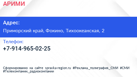 АРИМИ по адресу Приморский край, Фокино, Тихоокеанская, 2 в дальнейшем Организация, размещена в следующих категориях: