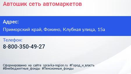 Автошик, сеть автомаркетов по адресу Приморский край, Фокино, Клубная улица, 15а в дальнейшем Организация, размещена в следующих категориях: