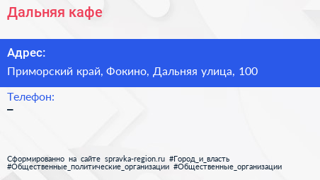 Дальняя, кафе по адресу Приморский край, Фокино, Дальняя улица, 100 в дальнейшем Организация, размещена в следующих категориях: