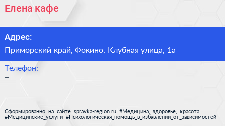Елена, кафе по адресу Приморский край, Фокино, Клубная улица, 1а в дальнейшем Организация, размещена в следующих категориях: