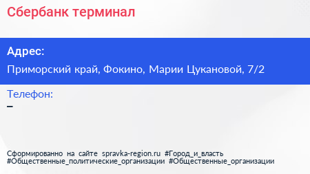 Сбербанк, терминал по адресу Приморский край, Фокино, Марии Цукановой, 7/2 в дальнейшем Организация, размещена в следующих категориях:
