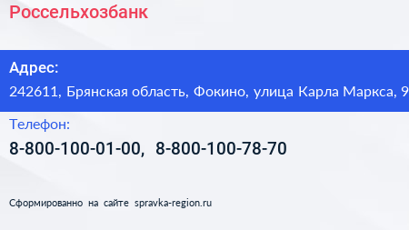 Россельхозбанк по адресу 242611, Брянская область, Фокино, улица Карла Маркса, 9 в дальнейшем Организация, размещена в следующих категориях: