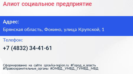 Алиот, социальное предприятие по адресу Брянская область, Фокино, улица Крупской, 1 в дальнейшем Организация, размещена в следующих категориях: