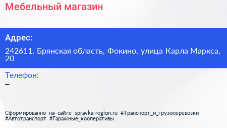 Мебельный магазин по адресу 242611, Брянская область, Фокино, улица Карла Маркса, 20 в дальнейшем Организация, размещена в следующих категориях: