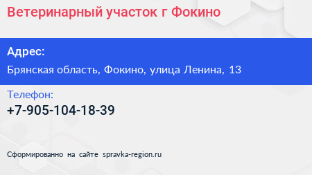 Ветеринарный участок г. Фокино по адресу Брянская область, Фокино, улица Ленина, 13 в дальнейшем Организация, размещена в следующих категориях: