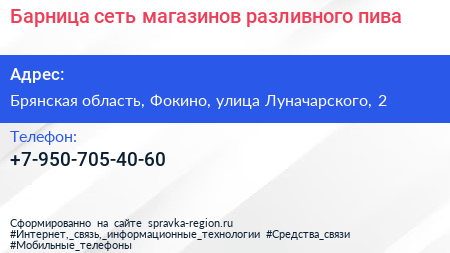 Барница, сеть магазинов разливного пива по адресу Брянская область, Фокино, улица Луначарского, 2 в дальнейшем Организация, размещена в следующих категориях: