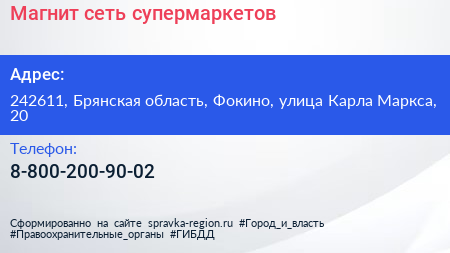 Магнит, сеть супермаркетов по адресу 242611, Брянская область, Фокино, улица Карла Маркса, 20 в дальнейшем Организация, размещена в следующих категориях: