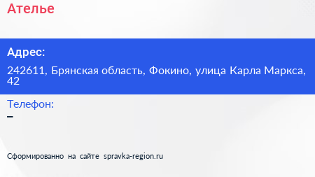 Ателье по адресу 242611, Брянская область, Фокино, улица Карла Маркса, 42 в дальнейшем Организация, размещена в следующих категориях: