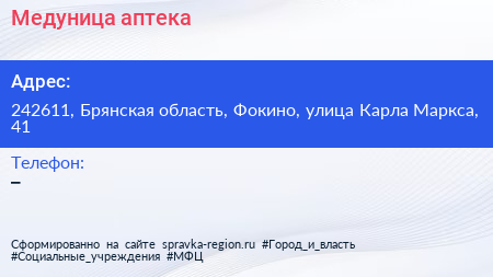 Медуница, аптека по адресу 242611, Брянская область, Фокино, улица Карла Маркса, 41 в дальнейшем Организация, размещена в следующих категориях: