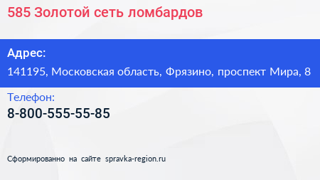 585*Золотой, сеть ломбардов по адресу 141195, Московская область, Фрязино, проспект Мира, 8 в дальнейшем Организация, размещена в следующих категориях: