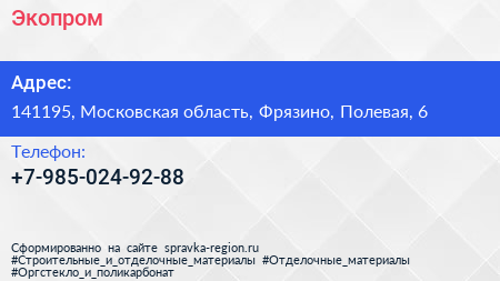 Экопром по адресу 141195, Московская область, Фрязино, Полевая, 6 в дальнейшем Организация, размещена в следующих категориях: