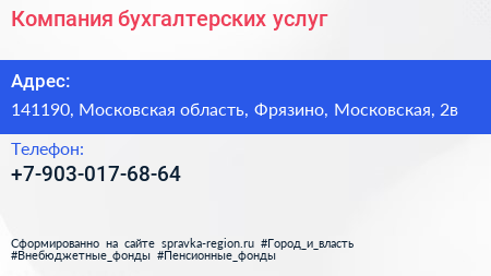 Компания бухгалтерских услуг по адресу 141190, Московская область, Фрязино, Московская, 2в в дальнейшем Организация, размещена в следующих категориях: