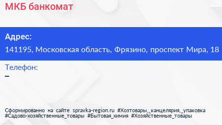 МКБ, банкомат по адресу 141195, Московская область, Фрязино, проспект Мира, 18 в дальнейшем Организация, размещена в следующих категориях: