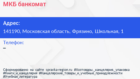 МКБ, банкомат по адресу 141190, Московская область, Фрязино, Школьная, 1 в дальнейшем Организация, размещена в следующих категориях: